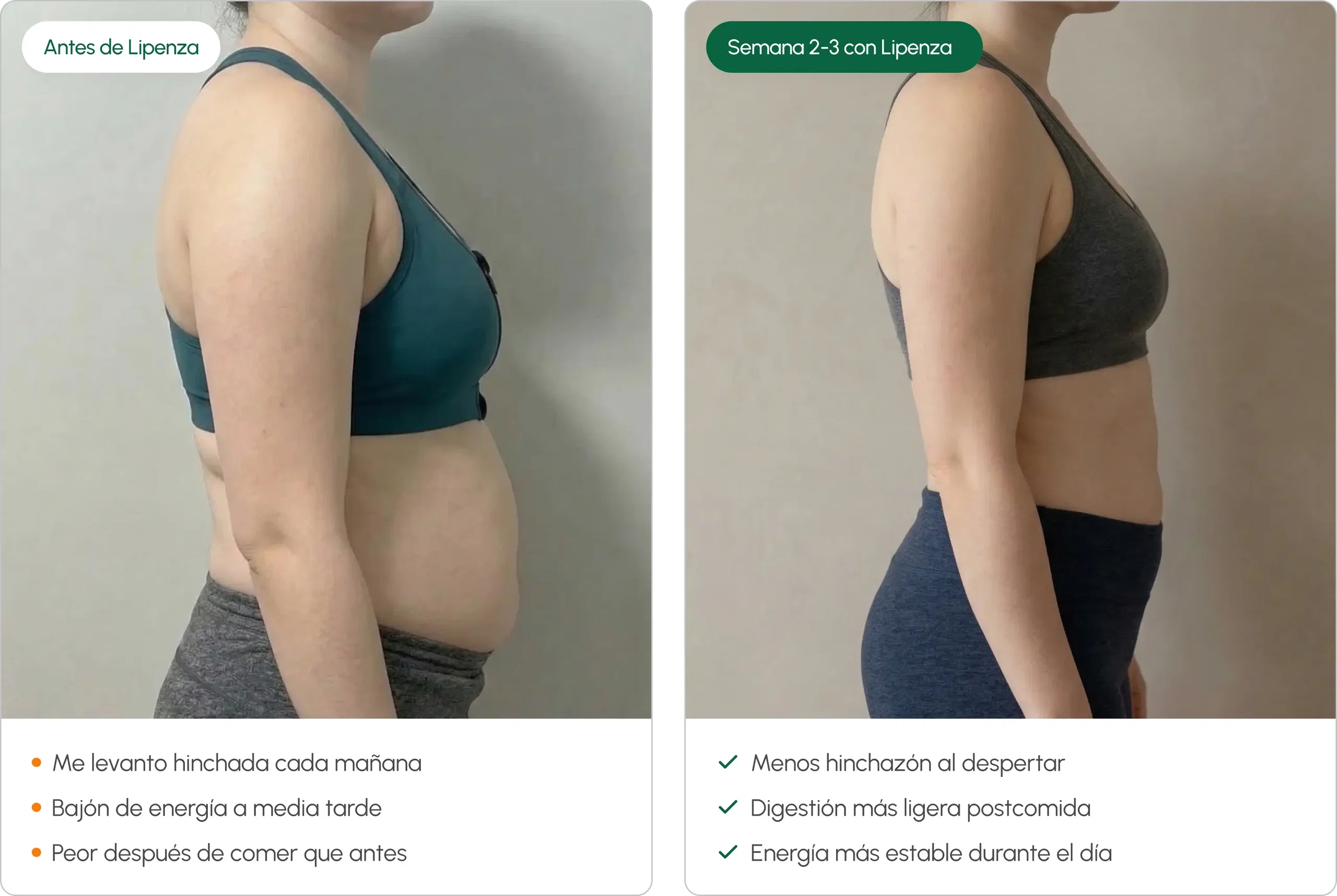 "Llevaba años sin entender por qué me sentía tan hinchada. En tres semanas con Lipenza lo noté. En dos meses cambió todo."